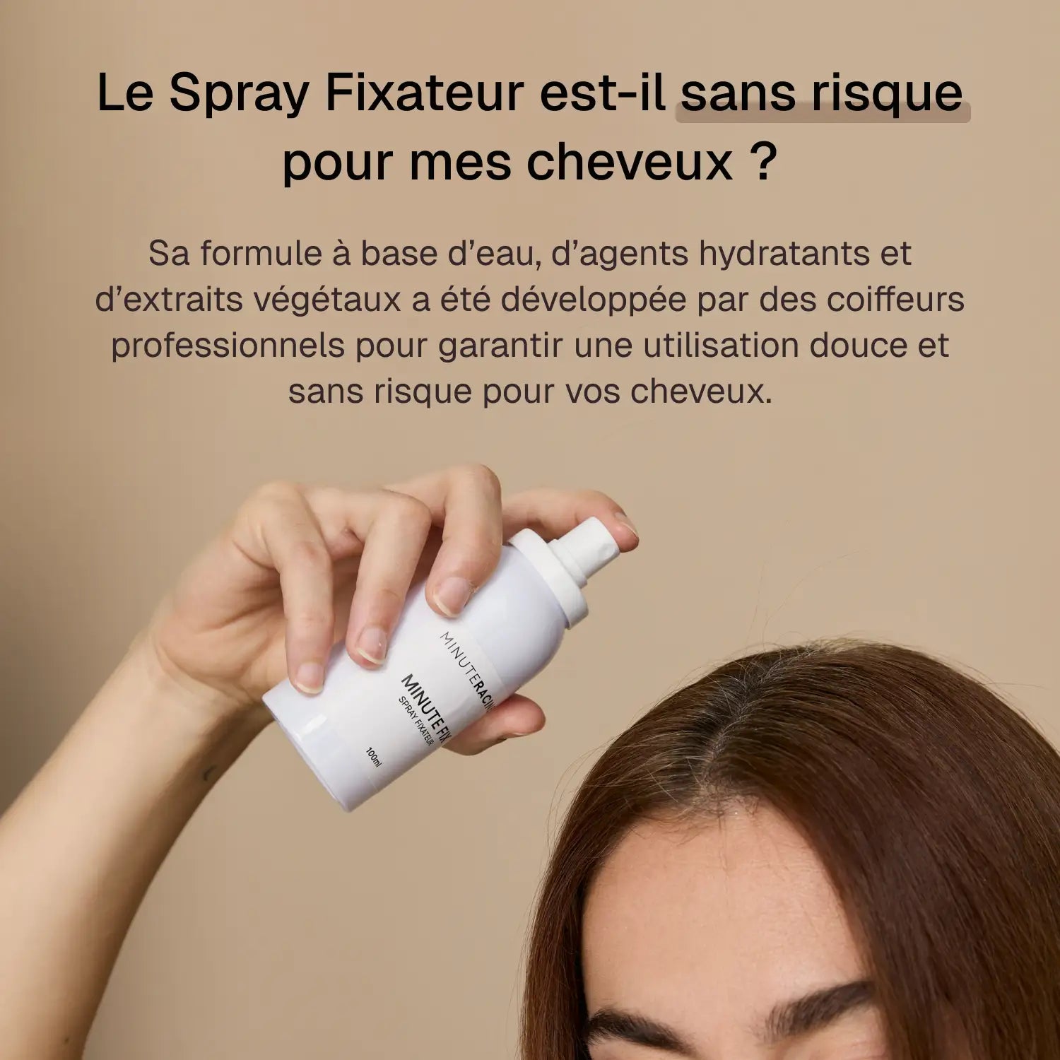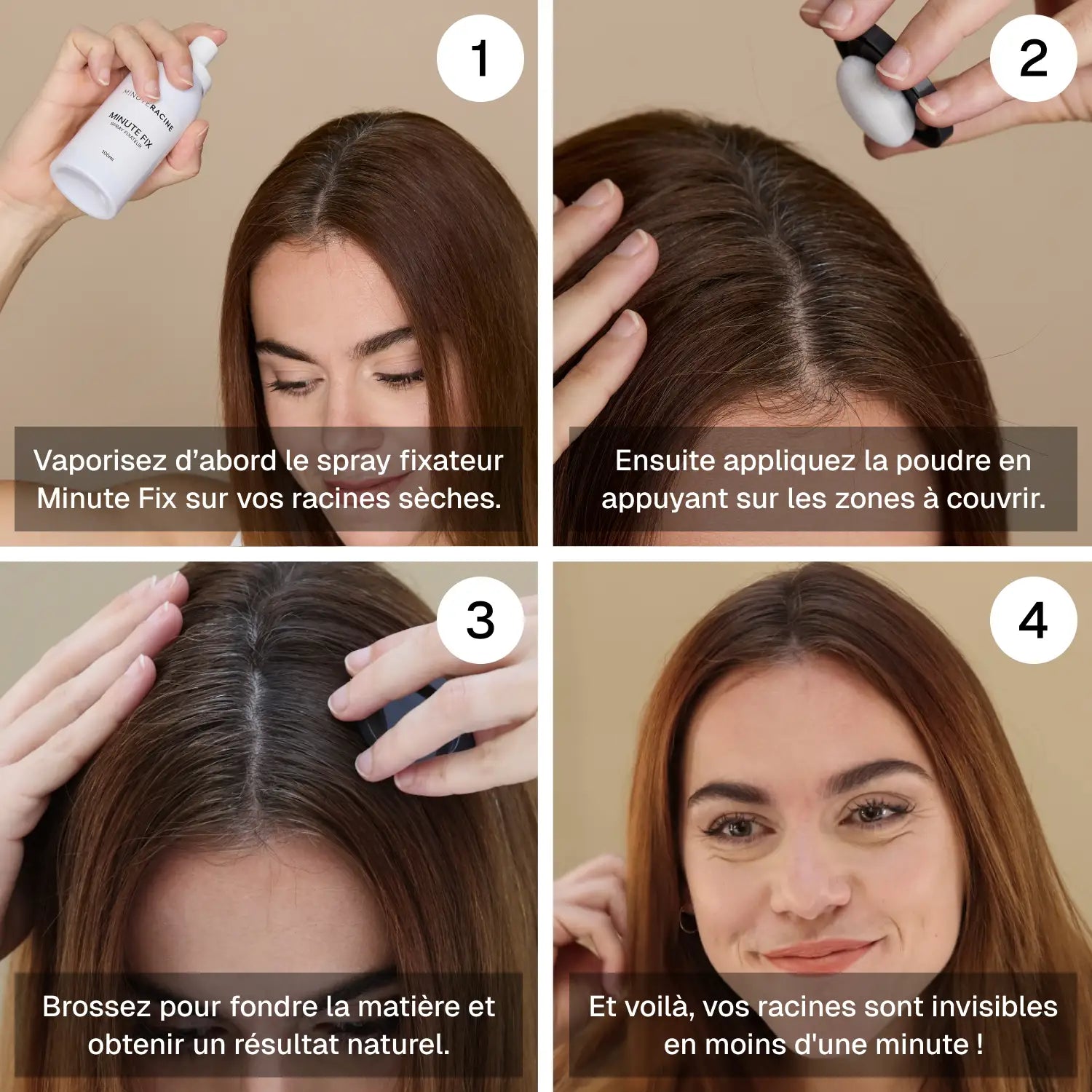 - Vaporisez d’abord le spray fixateur Minute Fix sur vos racines sèches.